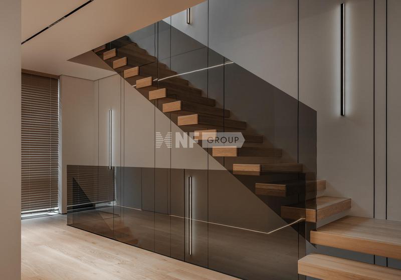 Лестница, которая соединяет все уровни — сама по себе акцент. Мрамор, подсветка ступеней, стеклянное ограждение, круглые зеркала на стене.