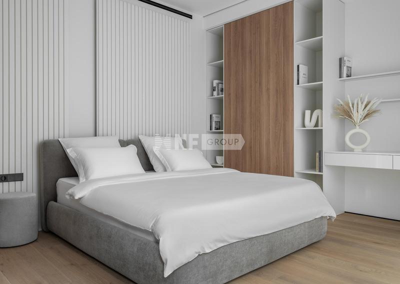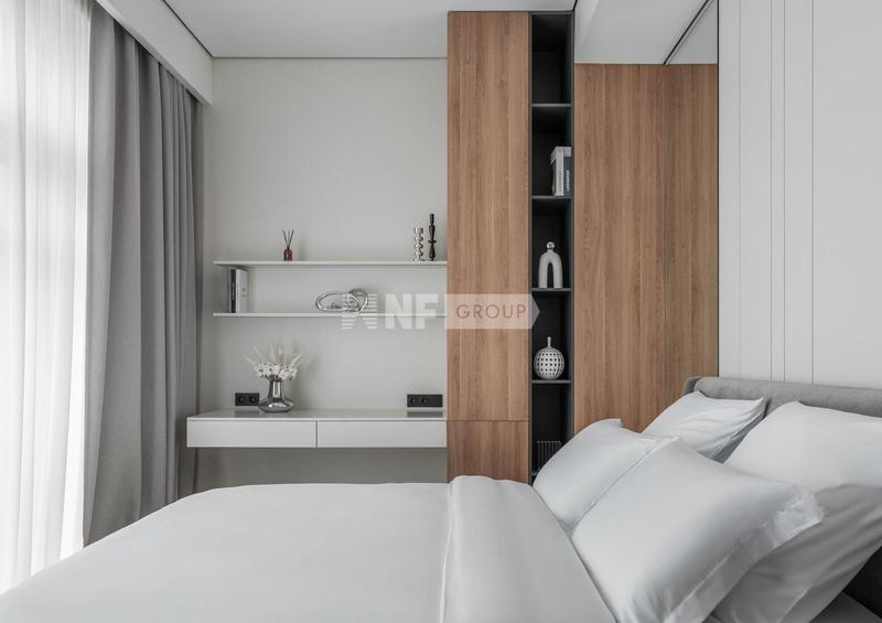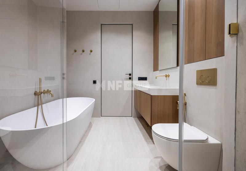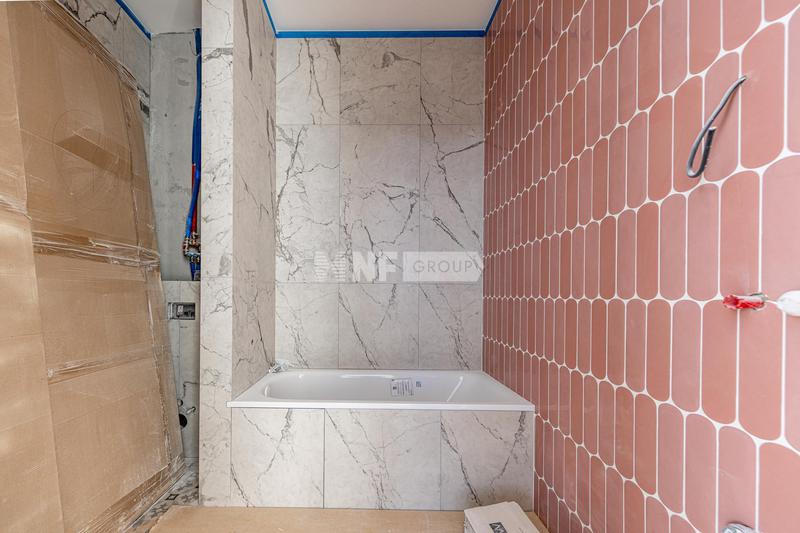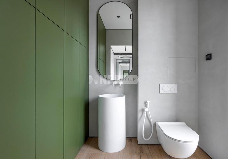 Третий этаж — приватная семейная зона. Мастер-спальня с гардеробной и санузлом для родителей. Две детские спальни с отдельным санузлом — каждая со своим характером: розовая с рабочей зоной и большим шкафом, светлая с рабочим местом. Детский санузел оформлен в розовом мраморе с неоновыми деталями.