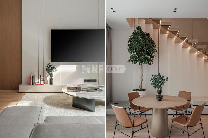 Первый этаж — для всей семьи сразу. Кухня с островом, обеденная зона на 6–8 человек и гостиная с телевизором — всё в едином пространстве, с выходом на террасу. Здесь собираются утром, здесь же принимают гостей вечером.
