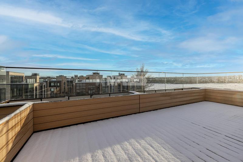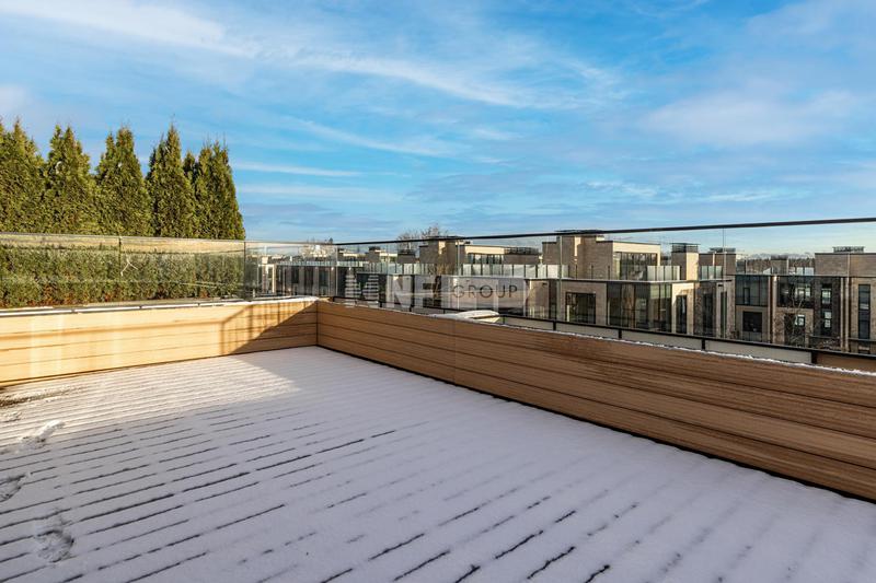 Четвёртый этаж — личное пространство. Сауна, душевая, санузел. И выход на эксплуатируемую кровлю: диванная зона, обеденный стол, детский домик, зелень в кадках. Летом это полноценная открытая комната.